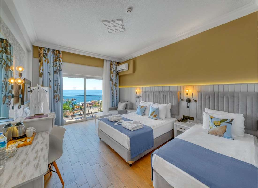 De tweepersoonskamer met zeezicht heeft dezelfde faciliteiten als de tweepersoonskamer (DBL), maar heeft tevens zeezicht.
